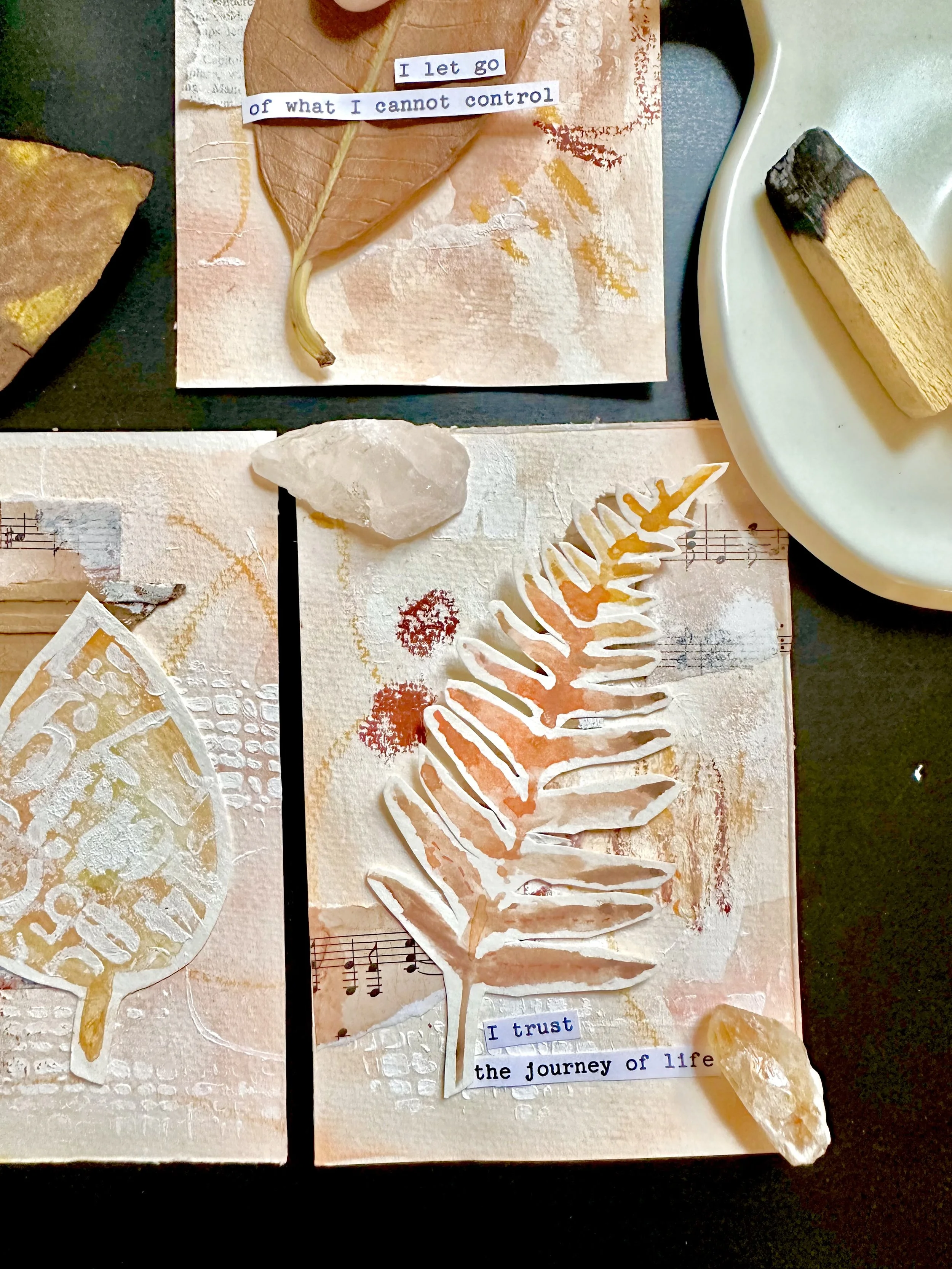 We’ll begin with a releasing meditation and a cleansing ritual to clear stagnant energy, alongside a short introduction to crystals that can support the process of letting go — helping us release emotional baggage, negative thoughts, and open the way forward. From there, you’ll be guided through the power of affirmations, centering your intentions on what you’re ready to release and what you wish to invite in. From there we’ll explore expressive techniques using watercolor washes, mark-making, collage, and layering — to craft a set of affirmation cards inspired by the natural process of letting go and embracing change.