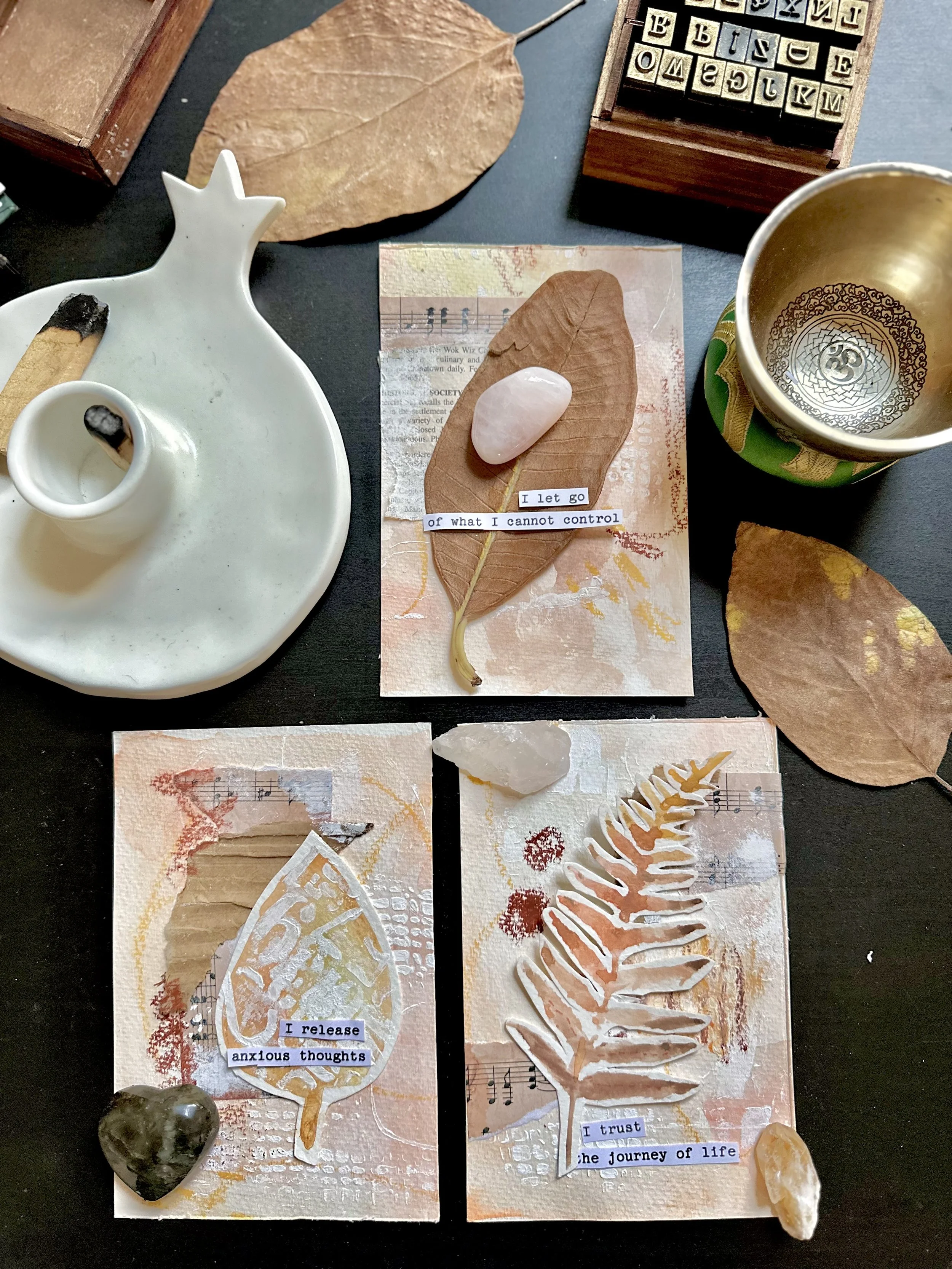 We’ll begin with a releasing meditation and a cleansing ritual to clear stagnant energy, alongside a short introduction to crystals that can support the process of letting go — helping us release emotional baggage, negative thoughts, and open the way forward. From there, you’ll be guided through the power of affirmations, centering your intentions on what you’re ready to release and what you wish to invite in. From there we’ll explore expressive techniques using watercolor washes, mark-making, collage, and layering — to craft a set of affirmation cards inspired by the natural process of letting go and embracing change.