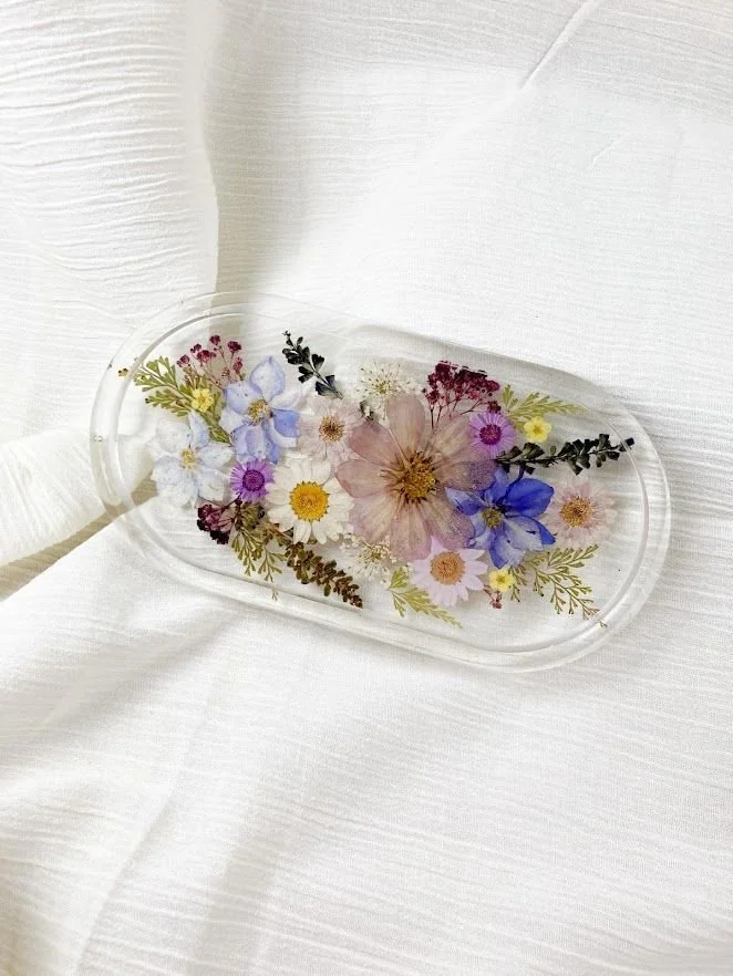 Create a beautiful trinket tray decorated with dried pressed flowers and other ornaments in resin as a home accessory or gift it to your loved ones.