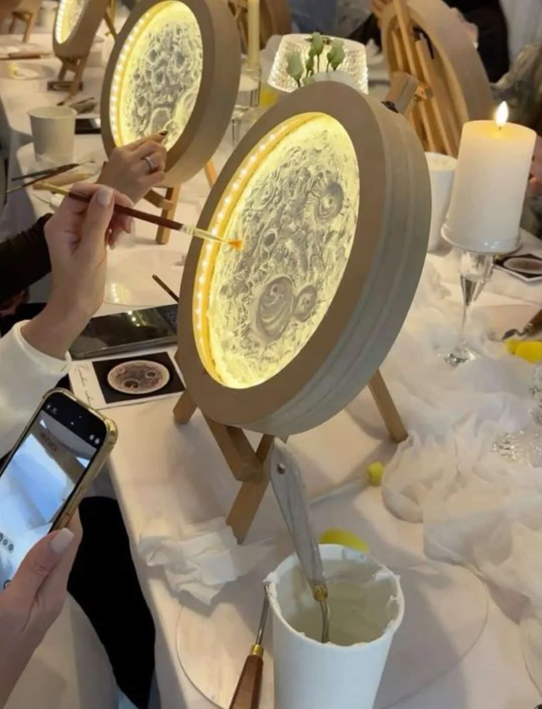 Each participant will design a textured moon surface using acrylic techniques, metallic accents, and layered materials, then integrate soft warm LED lighting to transform their artwork into a functional illuminated art piece suitable for home display.