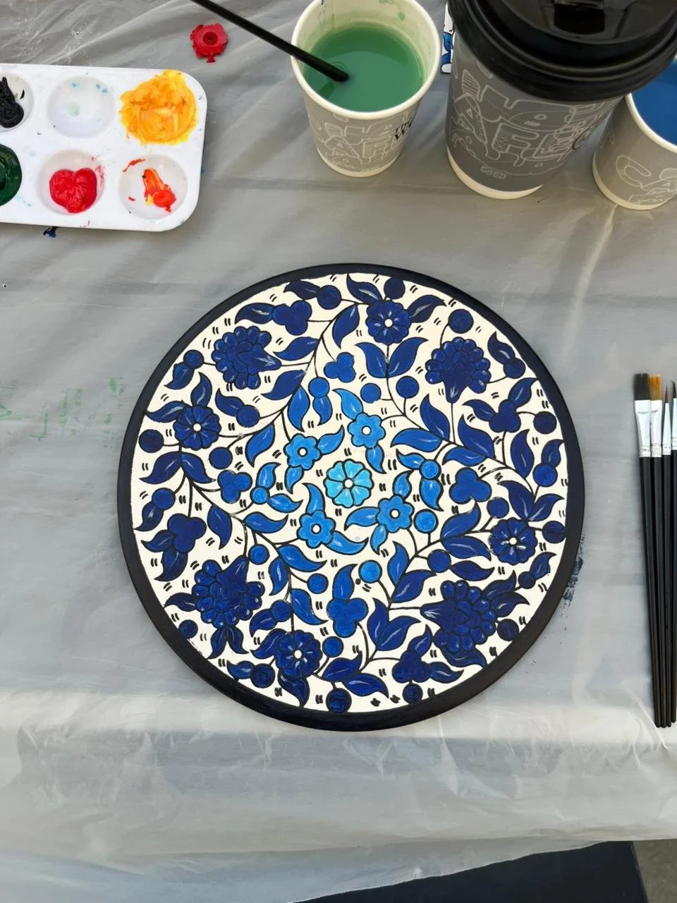 We’ll provide you with a Palestinian handmade ceramic plate along with paints and brushes and a display stand to showcase your work at home.